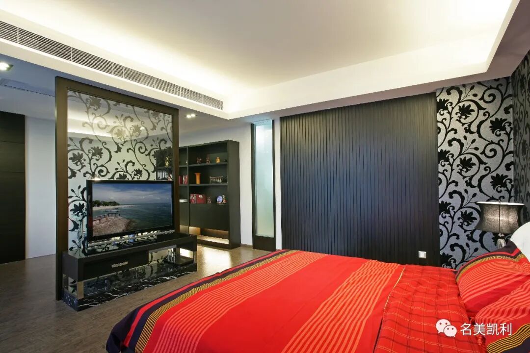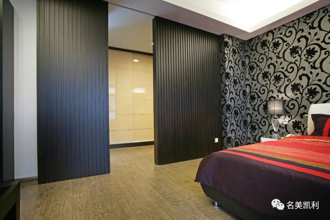 主卧室硬装主色调为软深沉的木纹及灰花墙纸,在软装设计上,设计师则以暖灰呼应。床品上的局部红色跳脱出来,成为视觉焦点。不盲目追逐潮流,设计师用保持克制的、追求极致细节且独立思考的精神,来创造空间氛围的“高级感”。