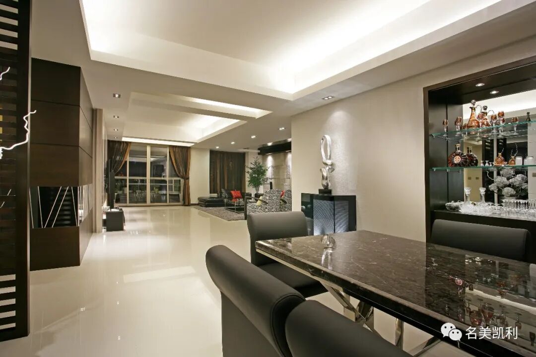 餐厅延续黑灰基调,耀黑的大理石餐桌倒映着温暖的光亮,四周布置着小摆件,烟火气息间多了一丝艺术感。