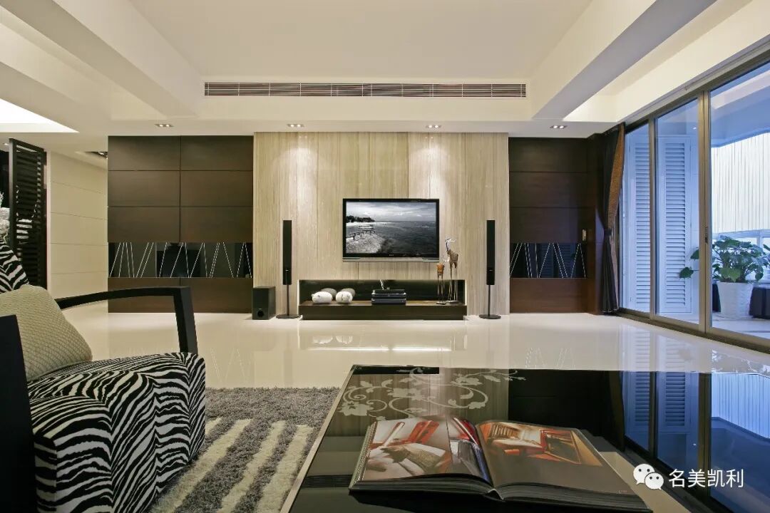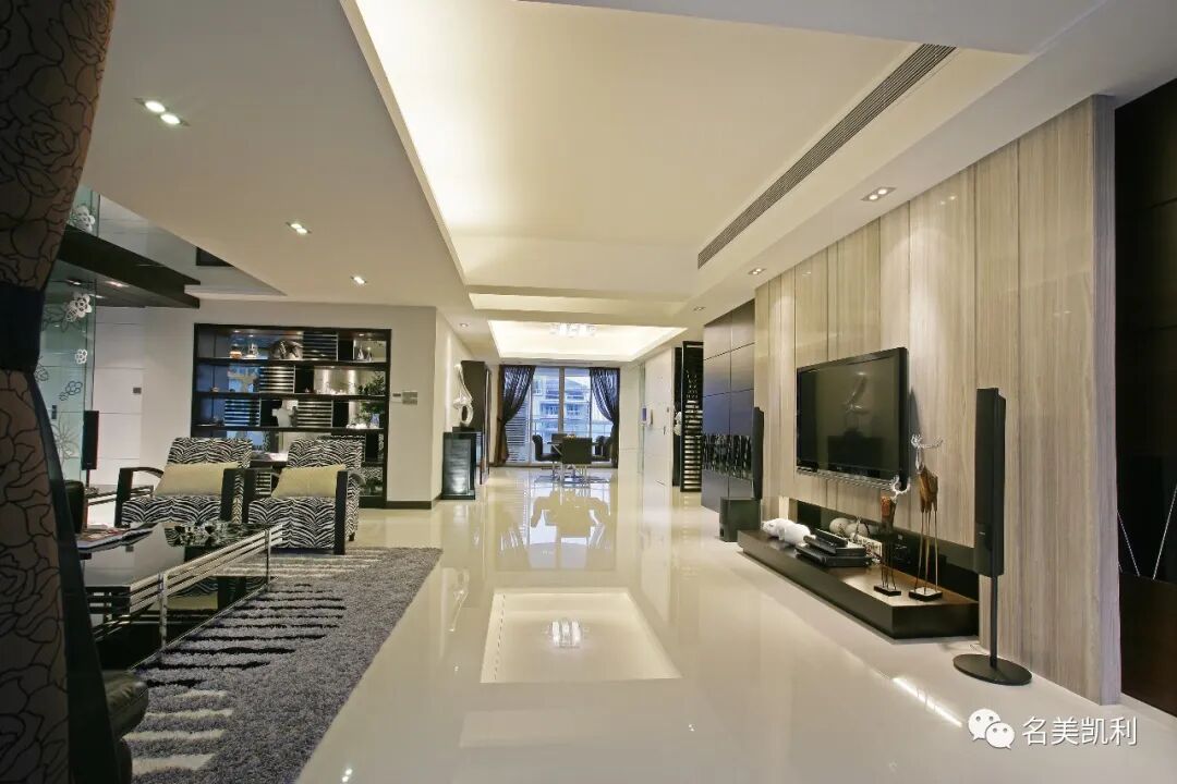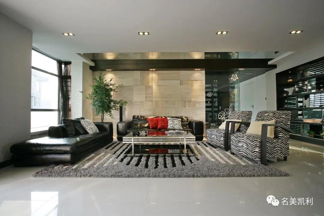 客厅的组合沙发与毛绒地毯相呼应,简约却不失大气。背景墙与地砖在颜色上形成统一,又通过灯光传递出优雅气质。